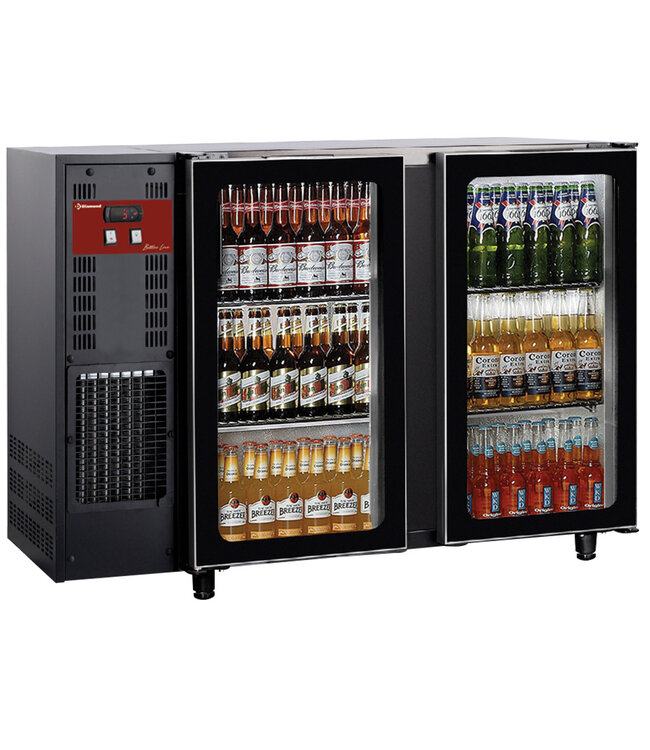 Deze koeling met glazen deuren (Thermopane®) van 510 mm breed biedt een nuttige doorgang van 470xh737 mm en is voorzien van LED-verlichting op elke deur. De binnenafmetingen zijn 1120x430x737 mm, met een laadvermogen van 294 flessen (33 cl) of 420 blikjes (33 cl), en 252 flessen (50 cl). De kast bevat 2 gerilsaniseerde roosters (450x430 mm) per deur, verstelbaar, en biedt een opslagruimte voor staande flessen met een vrije hoogte van 737 mm. De buitenkant is afgewerkt in zwarte Skinplate en de binnenkant in witte Skinplate, wat bescherming biedt tegen corrosie en 7 jaar garantie garandeert.