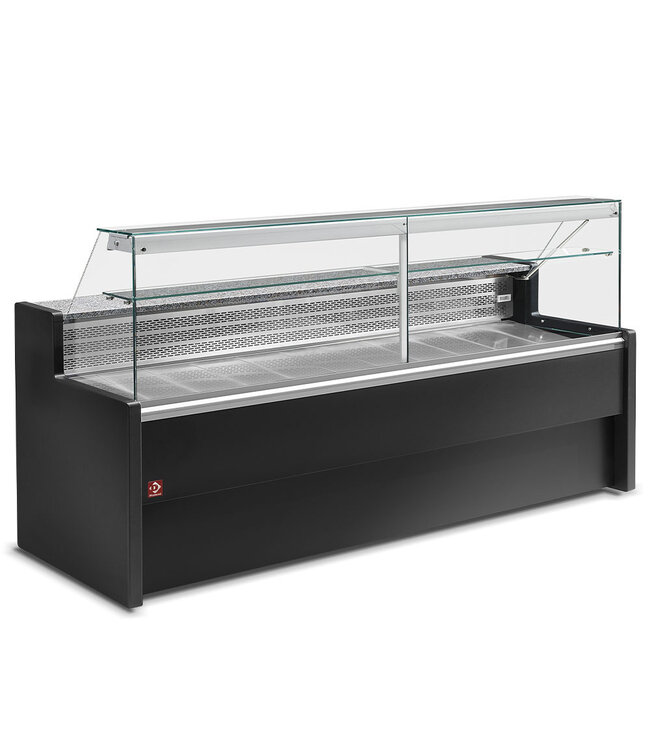 Het bedieningspaneel, met een elektronische regelaar (digitaal display), lichtschakelaar en analoge thermometer in de belichting, biedt nauwkeurige controle. Twee verdampers (statisch), behandeld tegen voedingszuren, en automatische ontdooiing zorgen voor optimale conservering.