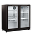 zwart, gemoffeld plaatstaal voor koeling van o.a. flessen en blikjes, temperatuur digitaal instelbaar van +2°C / +10°C, met ventilator voor luchtcirculatie, binnenverlichting en twee verstelbare rekken (35x40cm) per deur, deuren zijn zelf sluitend