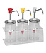 drukknopdispensers met roestvrijstalen deksel en glasheldere kunststof containers, dosering is instelbaar van ca. 20-40 ml/gr