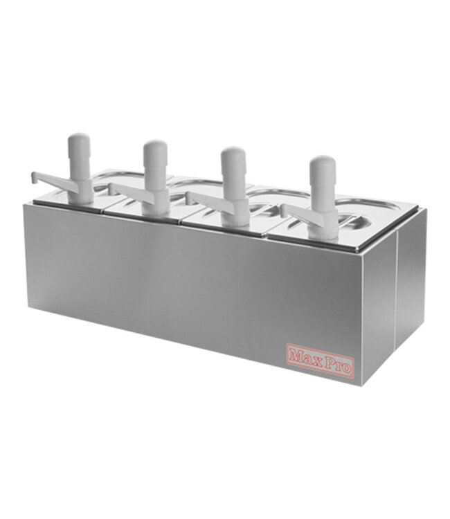 4 delige sauzenbar volledig uit roestvrijstaal met deksel met gat en kunststof drukknopdispensers