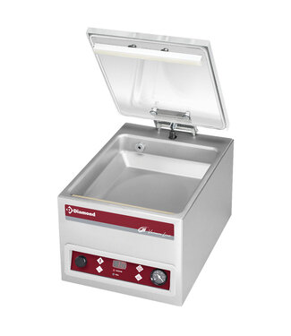 De professionele vacuüm machine is uitgerust met een Busch vacuümpomp, met een capaciteit van 8m3/uur. De cyclus varieert van 15 tot 35 seconden. De vacuümkamer heeft afmetingen van 280x310xh85 mm, met een laslengte van 280 mm. Geleverd met een volumetrische invoerplaat voor een snelle cyclus en optimale productpositionering. Het digitale bedieningspaneel kan een programma onthouden en de pomp eenvoudig onderhouden en reinigen. Op verzoek zijn een hellende plaat voor vloeibare producten en een transparante bolvormige deksel beschikbaar. Deze professionele tafelmachine biedt nauwkeurige vacuümregeling in procenten dankzij de geïntegreerde sensor, waardoor het risico op onvolledig vacuüm wordt geëlimineerd. De vacuümkamer is gestanst in roestvrij staal AISI 304 voor eenvoudig onderhoud en perfecte hygiëne. De lasbalk is verwijderbaar en zorgt voor een dubbele lasnaad van 3,5 mm voor optimale afdichting. Het platte transparante deksel opent gemakkelijk met een zuiger. Het frame is gemaakt van roestvrij staal AISI 304 voor maximale robuustheid en duurzaamheid. Deze machine voldoet aan de geldende CE-normen.